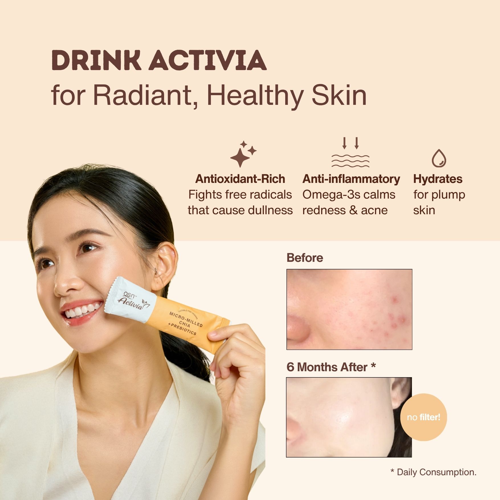 Add one sachet of OSN Activia into 250ml – 400ml of room temperature water. Wait for 2-3 minutes and stir well before drinking. Consume at least one sachet everyday for optimal results.