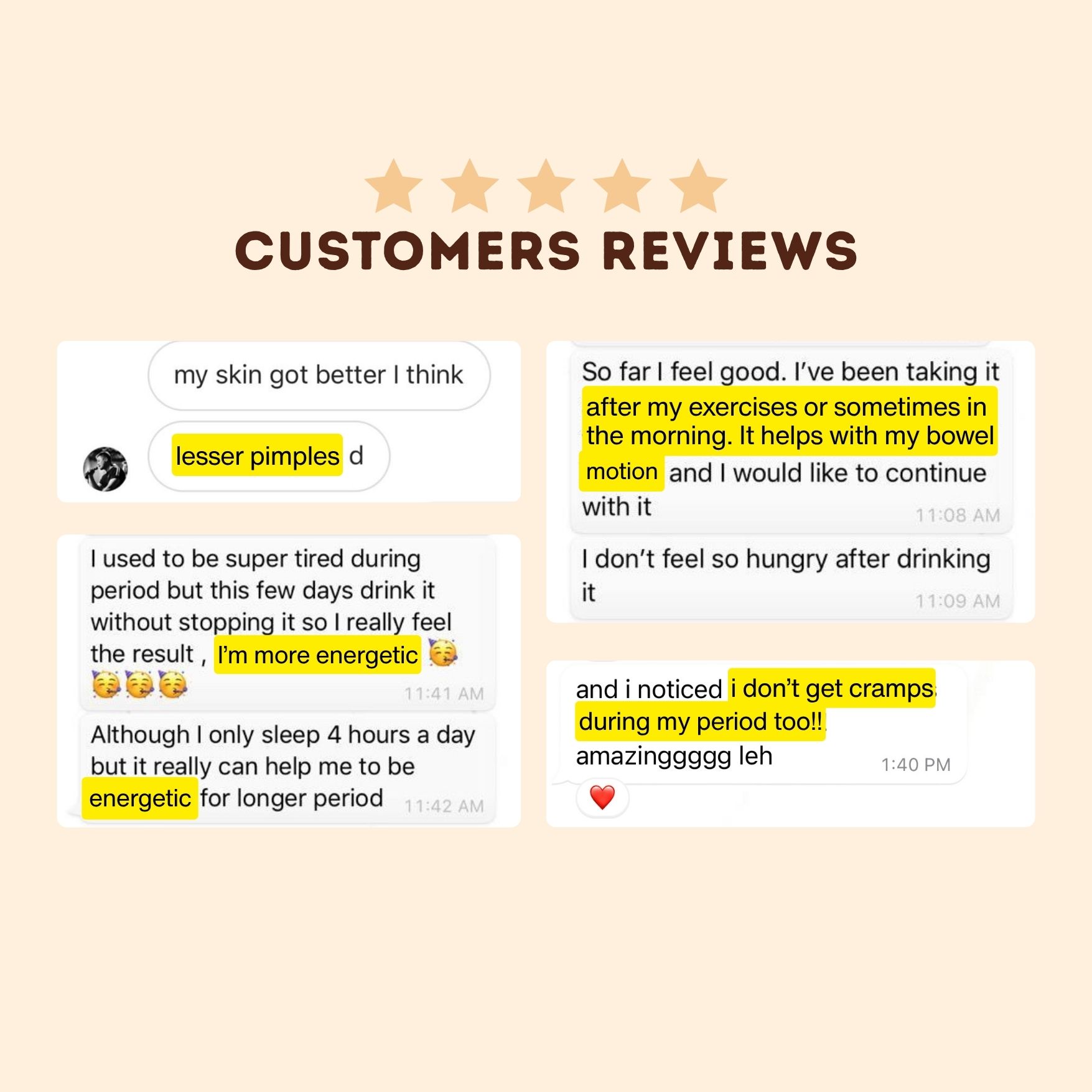 C********I really believe in this product that's why I keep on posting it everyday. And whenever I see my friends posted about their skin problem or constipation problem etc I'll ask them to try out also! I've been asking my friends who bought it how they feel after consuming the product. So far so good!
